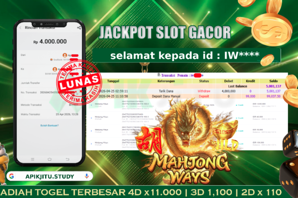 Bukti JP Slot MAHJONG WAYS – Kami mengucapkan selamat kepada saudara / saudara untuk user ID IW**** atas kemenangan di permainan mesin Slot MAHJONG WAYS  dengan total kemenangan sebesar Rp 4,000,000,– rupiah. Kemenangan ini yang pastinya sudah dibayar LUNAS sesuai dengan bukti yah saudara / saudara. Apikjitu nih bray, berapapun kemenangan anda akan tetap kami…