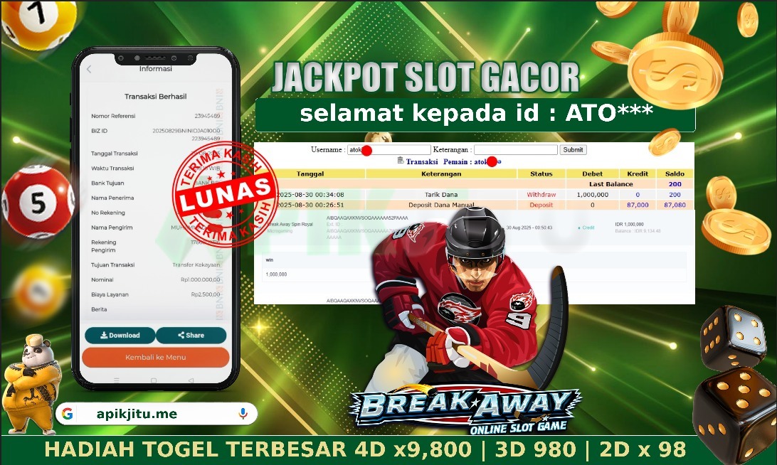Bukti JP SLOT Break Away Spin Royal – Kami mengucapkan selamat kepada saudara / saudara untuk user ID ATO*** atas kemenangan di permainan mesin SLOT Break Away Spin Royal dengan total kemenangan sebesar Rp 1,000,000,– rupiah. Kemenangan ini yang pastinya sudah dibayar LUNAS sesuai dengan bukti yah saudara / saudara. Apikjitu nih bray, berapapun kemenangan anda akan tetap kami bayar sampai tuntas yah bray.