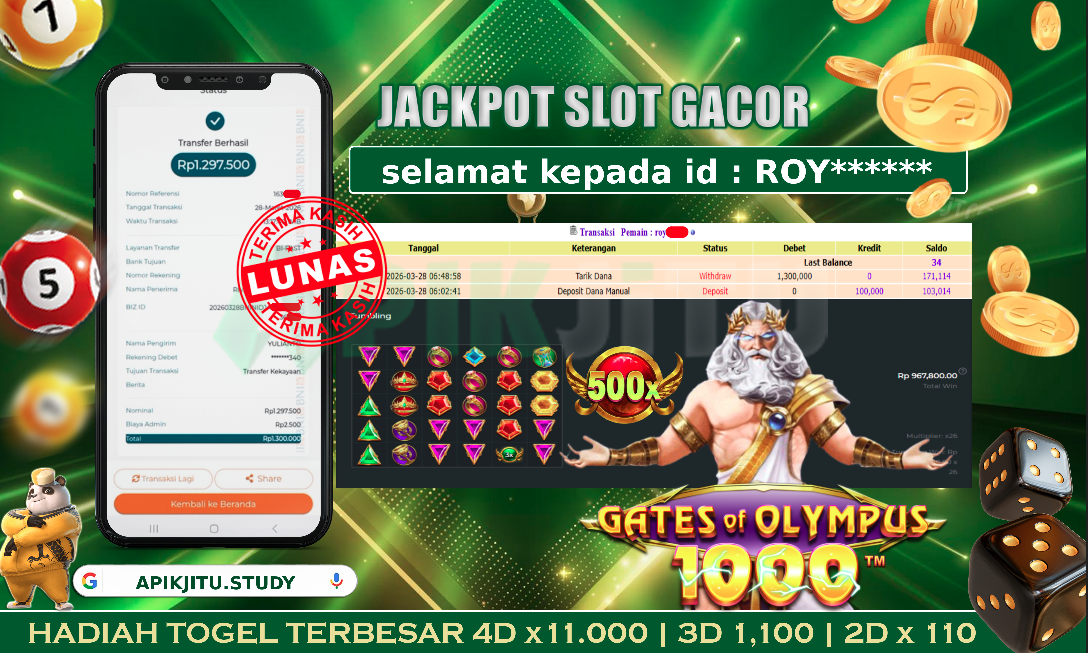 Bukti JP Slot GATES OF OLYMPUS 1000– Kami mengucapkan selamat kepada saudara / saudara untuk user ID ROY****** atas kemenangan di permainan mesin Slot GATES OF OLYMPUS 1000 dengan total kemenangan sebesar Rp 1,300,000,– rupiah. Kemenangan ini yang pastinya sudah dibayar LUNAS sesuai dengan bukti yah saudara / saudara. Apikjitu nih bray, berapapun kemenangan anda akan tetap kami bayar sampai tuntas yah bray.
