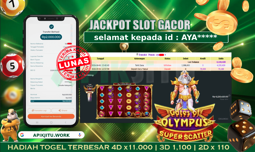 Bukti JP Slot GATES OF OLYMPUS SUPER SCATTER – yang kami posting ini sah dan real tanpa merekayasa yah dan hanya bertujuan untuk meningkatkan kepercayaan para member kami dan memberikan kenyamanan saat melakukan taruhan di situs kami, Jadi bosku tidak perlu khawatir BERAPAPUN KEMENANGAN KALIAN PASTI DIBAYAR LUNAS !! . Teman – teman sekalian sudah daftar di APIKJITU belum yah..?, Jika belum jangan tunggu lagi, ayuk segera daftar dan mainkan game SLOT GACOR kami yang sedang ONFIRE ini bisa jadi saudara / misalnyaku merupakan orang beruntung yang akan JP PAUS berikutnya nih!!.