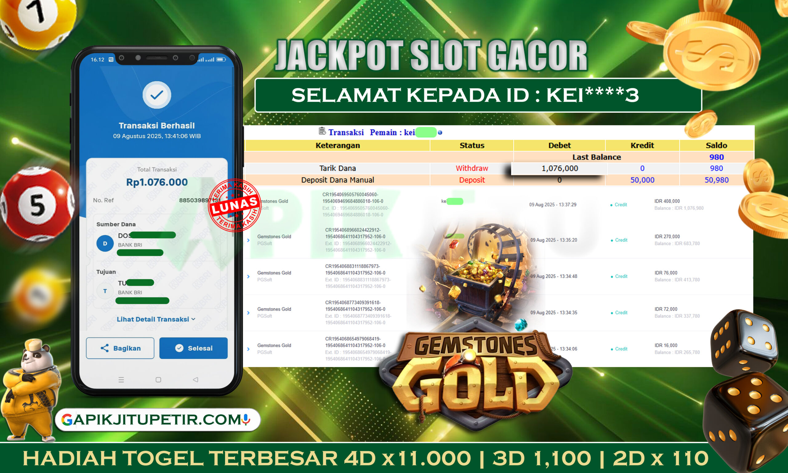 Bukti JP Slot GEMSTONES GOLD – Kami mengucapkan selamat kepada saudara / saudara untuk user ID KEI****3 atas kemenangan di permainan mesin Slot GEMSTONES GOLD dengan total kemenangan sebesar Rp 1,076,000,– rupiah. Kemenangan ini yang pastinya sudah dibayar LUNAS sesuai dengan bukti yah saudara / saudara. Apikjitu nih bray, berapapun kemenangan anda akan tetap kami bayar sampai tuntas yah bray.