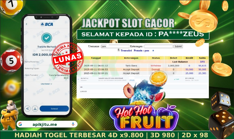 Bukti JP Slot HOT HOT FRUIT – Kami mengucapkan selamat kepada saudara / saudara untuk user ID PA***ZEUS atas kemenangan di permainan mesin Slot HOT HOT FRUIT dengan total kemenangan sebesar Rp 2,000,000,– rupiah. Kemenangan ini yang pastinya sudah dibayar LUNAS sesuai dengan bukti yah saudara / saudara. Apikjitu nih bray, berapapun kemenangan anda akan tetap kami bayar sampai tuntas yah bray.