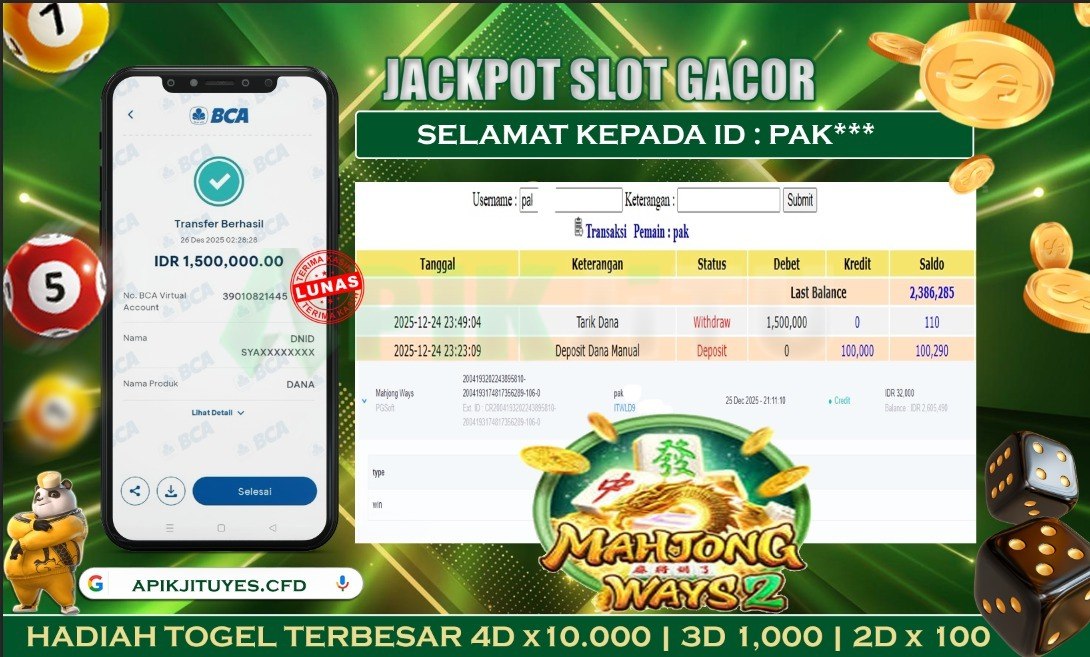 Bukti JP Slot MAHJONG WAYS 2– Kami mengucapkan selamat kepada saudara / saudara untuk user ID PAK*** atas kemenangan di permainan mesin Slot MAHJONG WAYS 2 dengan total kemenangan sebesar Rp 1,500,000,– rupiah. Kemenangan ini yang pastinya sudah dibayar LUNAS sesuai dengan bukti yah saudara / saudara. Apikjitu nih bray, berapapun kemenangan anda akan tetap kami bayar sampai tuntas yah bray.
