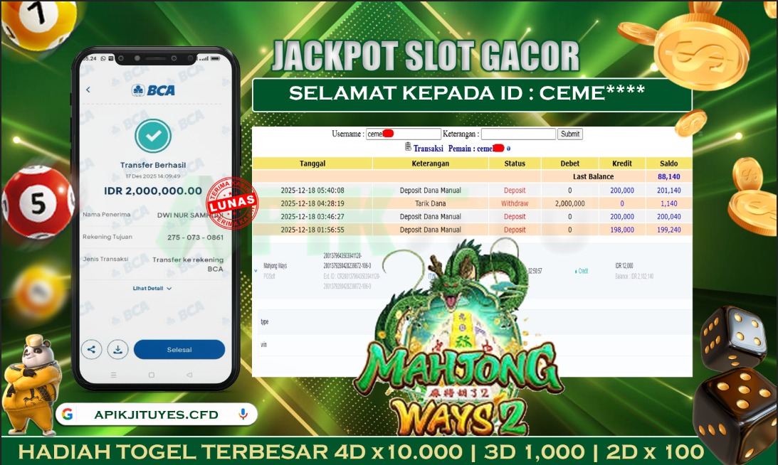Bukti JP Slot MAHJONG WAYS 2– Kami mengucapkan selamat kepada saudara / saudara untuk user ID CEME**** atas kemenangan di permainan mesin Slot MAHJONG WAYS 2 dengan total kemenangan sebesar Rp 2,000,000,– rupiah. Kemenangan ini yang pastinya sudah dibayar LUNAS sesuai dengan bukti yah saudara / saudara. Apikjitu nih bray, berapapun kemenangan anda akan tetap kami bayar sampai tuntas yah bray.