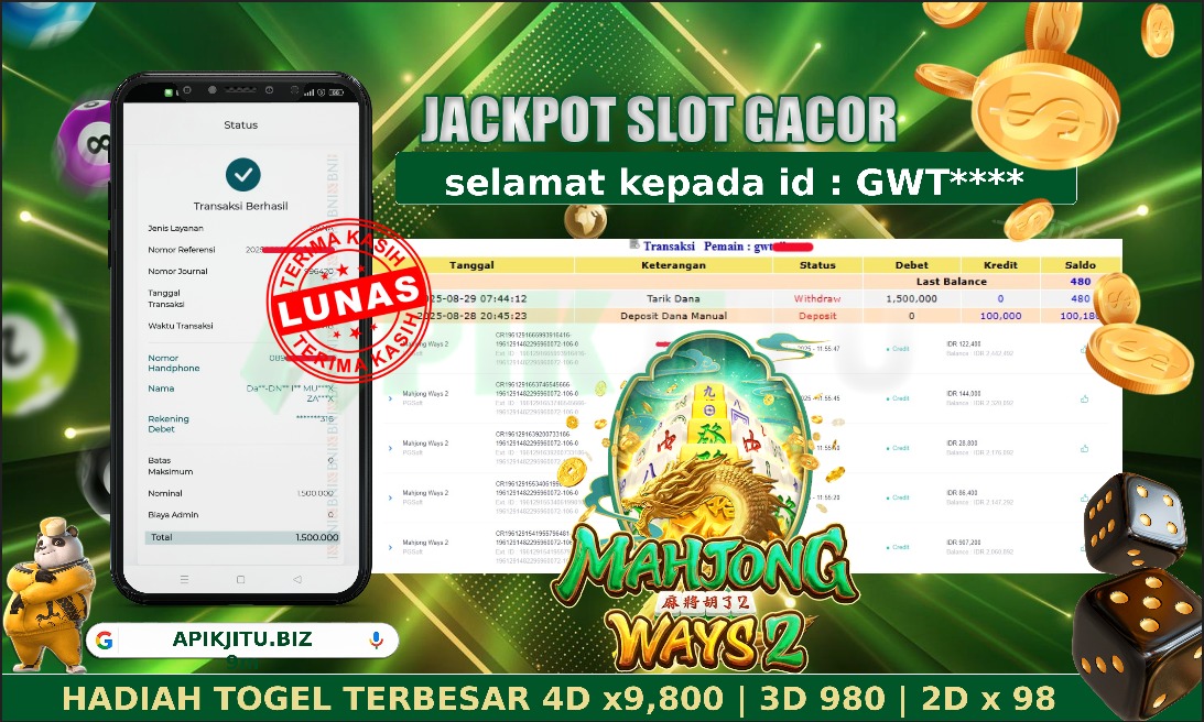 Bukti JP Slot MAHJONG WAYS 2 – Kami mengucapkan selamat kepada saudara / saudara untuk user ID GWT*** atas kemenangan di permainan mesin Slot MAHJONG WAYS 2 dengan total kemenangan sebesar Rp 1,500,000,– rupiah. Kemenangan ini yang pastinya sudah dibayar LUNAS sesuai dengan bukti yah saudara / saudara. Apikjitu nih bray, berapapun kemenangan anda akan tetap kami bayar sampai tuntas yah bray.