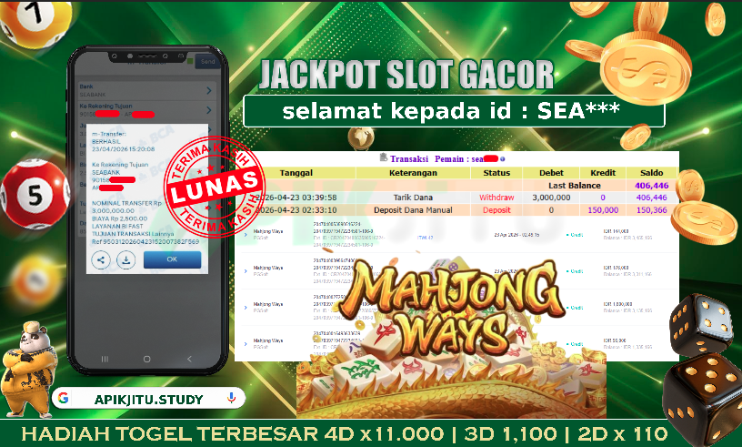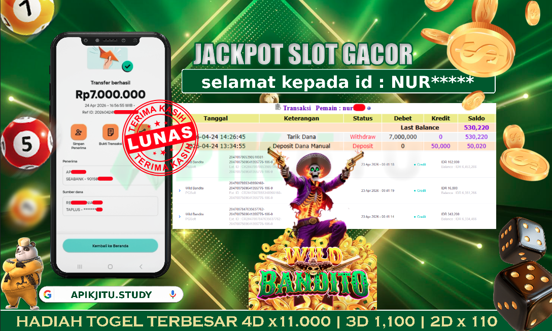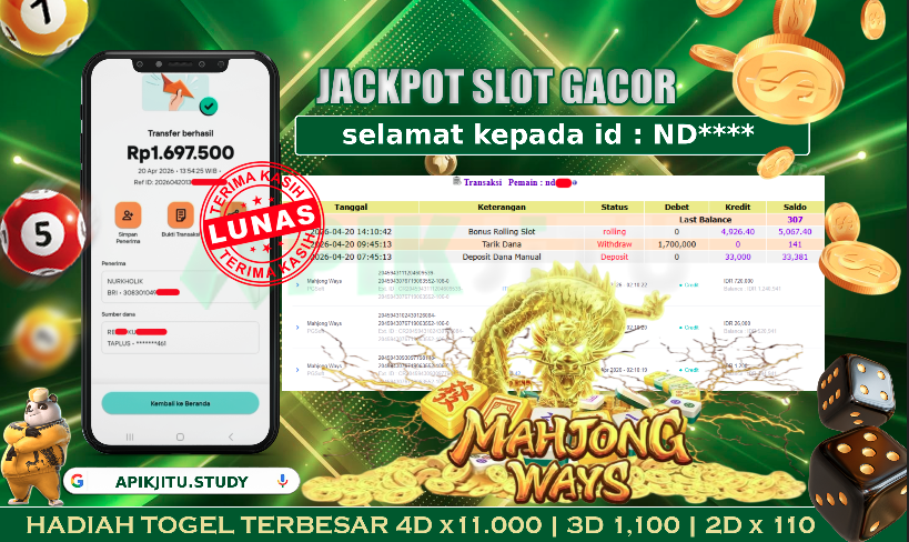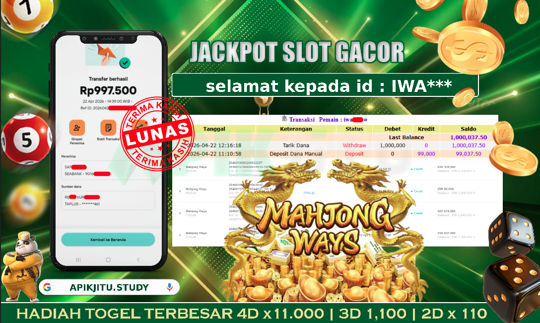 Bukti JP Slot MAHJONG WAYS – yang kami posting ini sah dan real tanpa merekayasa yah dan hanya bertujuan untuk meningkatkan kepercayaan para member kami dan memberikan kenyamanan saat melakukan taruhan di situs kami, Jadi bosku tidak perlu khawatir BERAPAPUN KEMENANGAN KALIAN PASTI DIBAYAR LUNAS !! . Teman – teman sekalian sudah daftar di APIKJITU belum yah..?, Jika belum jangan tunggu lagi, ayuk segera daftar dan mainkan game SLOT GACOR kami yang sedang ONFIRE ini bisa jadi saudara / misalnyaku merupakan orang beruntung yang akan JP PAUS berikutnya nih!!.