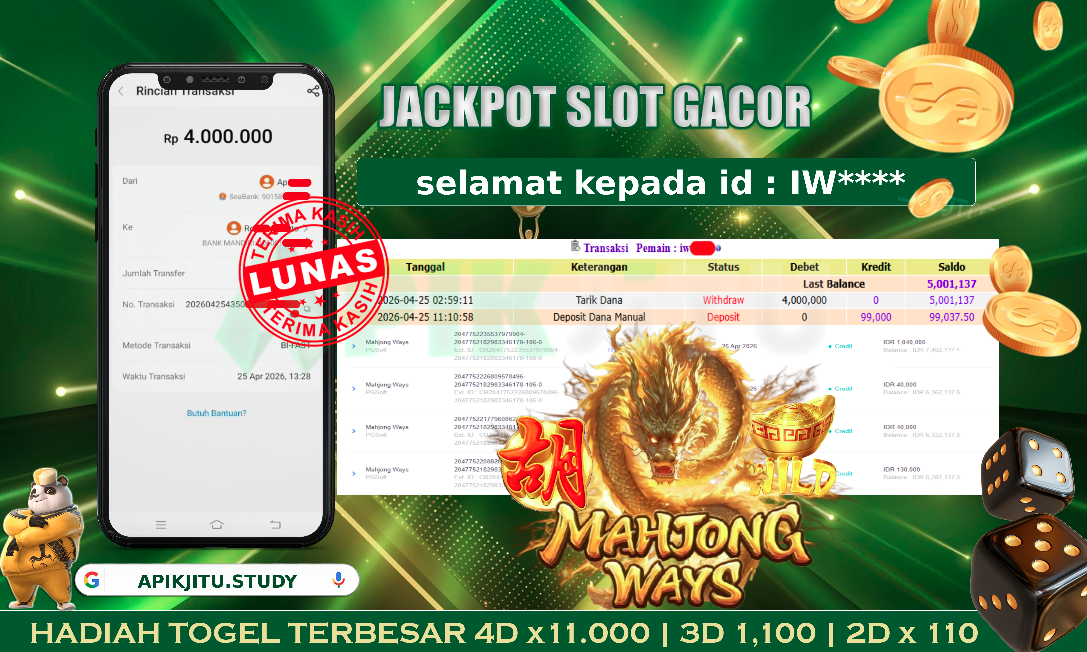 Bukti JP Slot MAHJONG WAYS – Kami mengucapkan selamat kepada saudara / saudara untuk user ID IW**** atas kemenangan di permainan mesin Slot MAHJONG WAYS dengan total kemenangan sebesar Rp 4,000,000,– rupiah. Kemenangan ini yang pastinya sudah dibayar LUNAS sesuai dengan bukti yah saudara / saudara. Apikjitu nih bray, berapapun kemenangan anda akan tetap kami bayar sampai tuntas yah bray.