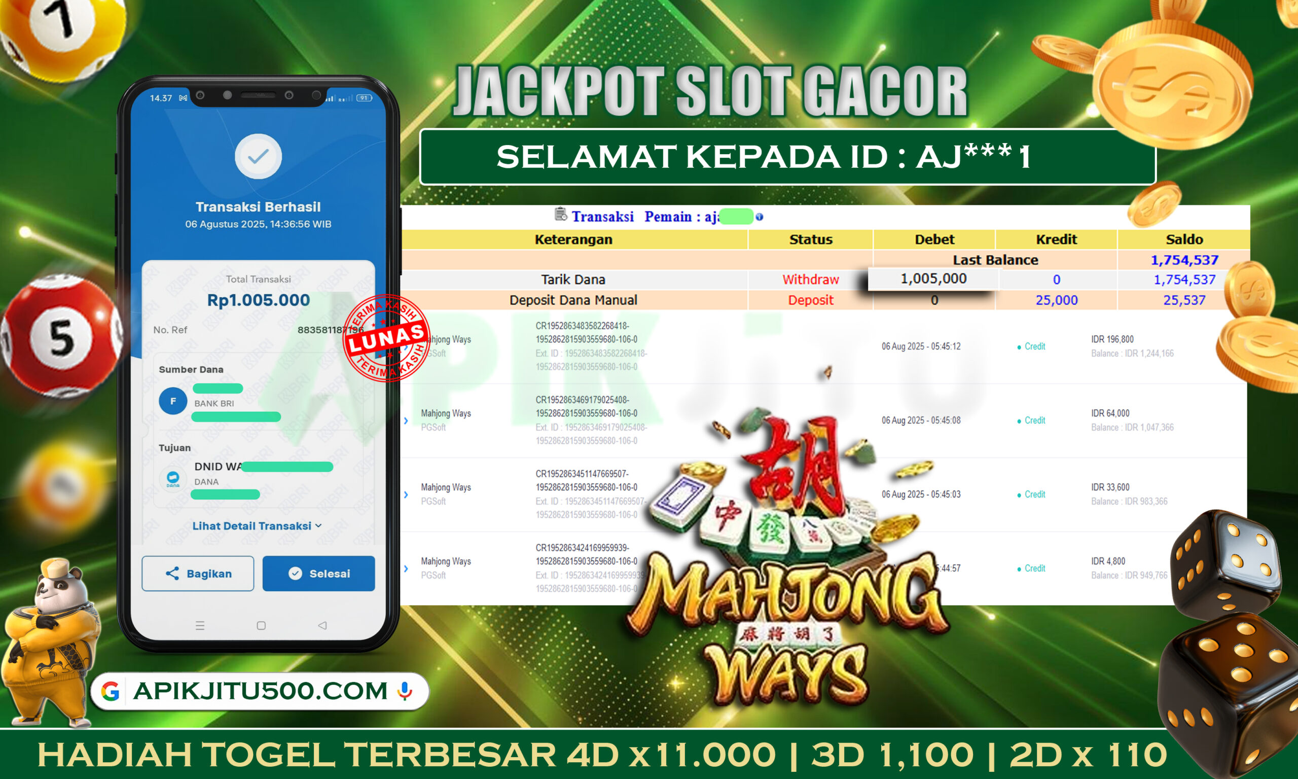 Bukti JP Slot MAHJONG WAYS – Kami mengucapkan selamat kepada saudara / saudara untuk user ID AJ***1 atas kemenangan di permainan mesin Slot MAHJONG WAYS dengan total kemenangan sebesar Rp 1,005,000,– rupiah. Kemenangan ini yang pastinya sudah dibayar LUNAS sesuai dengan bukti yah saudara / saudara. Apikjitu nih bray, berapapun kemenangan anda akan tetap kami bayar sampai tuntas yah bray.