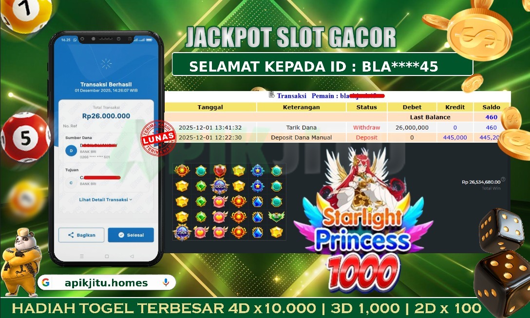 Bukti JP Slot STARLIGHT PRINCESS 1000– Kami mengucapkan selamat kepada saudara / saudara untuk user BLA***45 atas kemenangan di permainan mesin Slot STARLIGHT PRINCESS 1000 dengan total kemenangan sebesar Rp 26,000,000,– rupiah. Kemenangan ini yang pastinya sudah dibayar LUNAS sesuai dengan bukti yah saudara / saudara. Apikjitu nih bray, berapapun kemenangan anda akan tetap kami bayar sampai tuntas yah bray.
