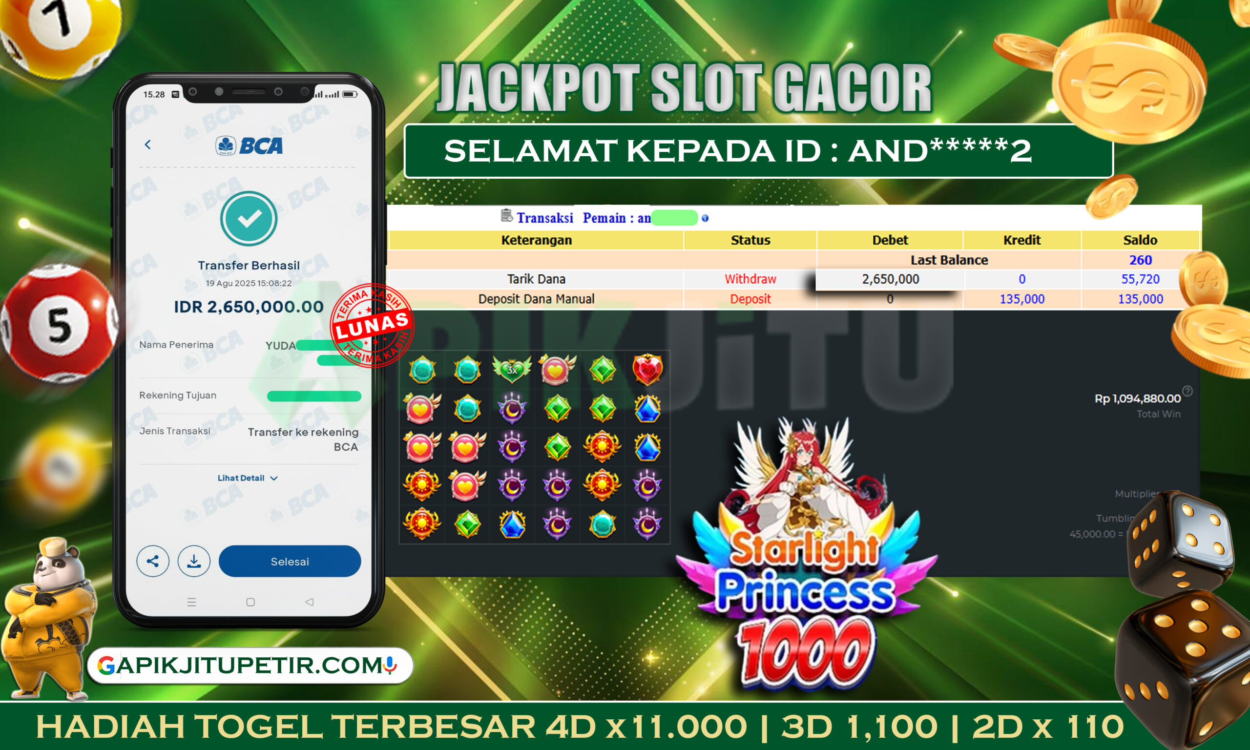 Bukti JP Slot STARLIGHT PRINCESS 1000 – Kami mengucapkan selamat kepada saudara / saudara untuk user ID AND*****2 atas kemenangan di permainan mesin Slot STARLIGHT PRINCESS 1000 dengan total kemenangan sebesar Rp 2,650,000,– rupiah. Kemenangan ini yang pastinya sudah dibayar LUNAS sesuai dengan bukti yah saudara / saudara. Apikjitu nih bray, berapapun kemenangan anda akan tetap kami bayar sampai tuntas yah bray.