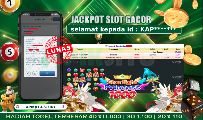 Bukti JP Slot STARLIGHT PRINCESS 1000– Kami mengucapkan selamat kepada saudara / saudara untuk user KAP******* atas kemenangan di permainan mesin Slot STARLIGHT PRINCESS 1000 dengan total kemenangan sebesar Rp 1,937,000,– rupiah. Kemenangan ini yang pastinya sudah dibayar LUNAS sesuai dengan bukti yah saudara / saudara. Apikjitu nih bray, berapapun kemenangan anda akan tetap kami bayar sampai tuntas yah bray.