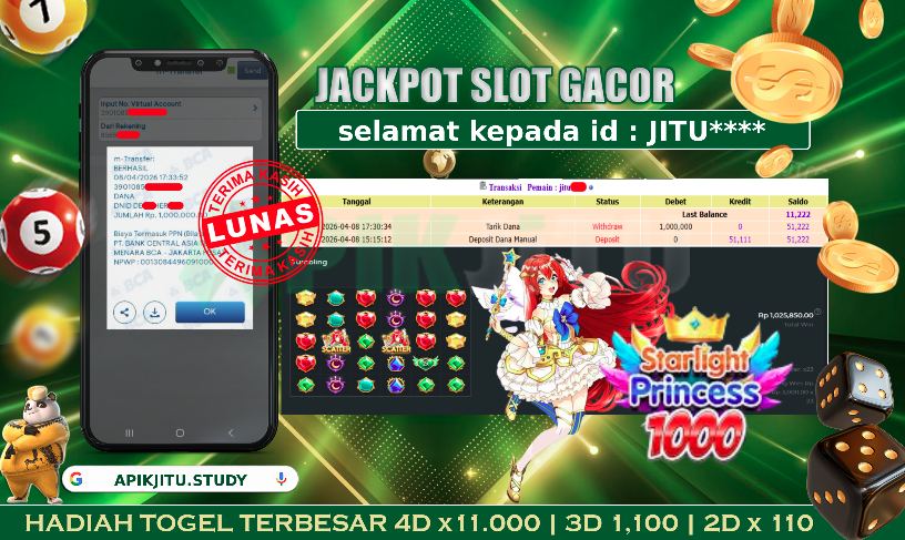Bukti JP Slot STARLIGHT PRINCESS 1000 – yang kami posting ini sah dan real tanpa merekayasa yah dan hanya bertujuan untuk meningkatkan kepercayaan para member kami dan memberikan kenyamanan saat melakukan taruhan di situs kami, Jadi bosku tidak perlu khawatir BERAPAPUN KEMENANGAN KALIAN PASTI DIBAYAR LUNAS !! . Teman – teman sekalian sudah daftar di APIKJITU belum yah..?, Jika belum jangan tunggu lagi, ayuk segera daftar dan mainkan game SLOT GACOR kami yang sedang ONFIRE ini bisa jadi saudara / misalnyaku merupakan orang beruntung yang akan JP PAUS berikutnya nih!!.