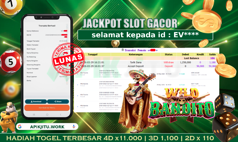 Bukti JP Slot WILD BANDITO – Kami mengucapkan selamat kepada saudara / saudara untuk user ID EV**** atas kemenangan di permainan mesin Slot WILD BANDITO  dengan total kemenangan sebesar Rp 1,250,000,– rupiah. Kemenangan ini yang pastinya sudah dibayar LUNAS sesuai dengan bukti yah saudara / saudara. Apikjitu nih bray, berapapun kemenangan anda akan tetap kami bayar sampai tuntas yah bray.