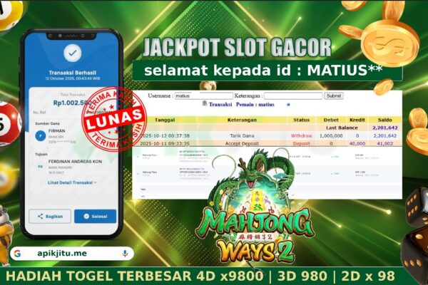 Bukti JP Slot MAHJONG WAYS 2 – Kami mengucapkan selamat kepada saudara / saudara untuk user ID MATIUS** atas kemenangan di permainan mesin Slot MAHJONG WAYS 2 dengan total kemenangan sebesar Rp 1,000,000,– rupiah. Kemenangan ini yang pastinya sudah dibayar LUNAS sesuai dengan bukti yah saudara / saudara. Apikjitu nih bray, berapapun kemenangan anda akan tetap…